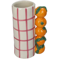 Avec son motif vichy rose peint à la main et sa poignée en 3D faite de mandarines juteuses, ce vase est un vrai concentré de bonne humeur. Il adore accueillir tes bouquets de saison, mais peut aussi se poser en solo comme une pièce forte sur une étagère, une table ou une console. Un clin d’œil fruité et coloré à l’audace méditerranéenne.