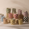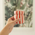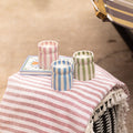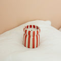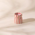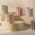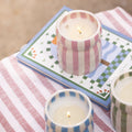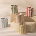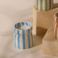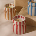 Toutes les bougies sont coulées dans un récipient en céramique réutilisable rayé aux couleurs uniques, véritables objets déco même une fois la cire consumée.